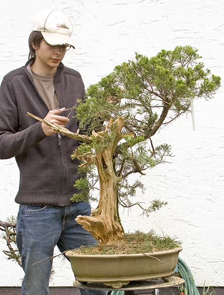 This is a very old garden juniper from the Chinensis family. Anyway, it sat in my garden for more than ten years now. Today Philipp worked on it to bring it one step further. Philipp practiced his carving skills with serious machines. Now the juniper will be for sale or trade. it should be possible for most enthusiasts to form a decent crown with the existing green.
