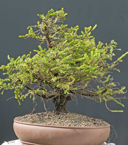 All long branches were pulled downward to form even more the image of a very old spruce. After a year or two the wire will be removed an the branches will ump back somewhat. First image before.