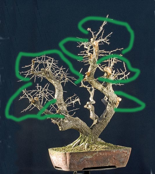 European hawthorn, Crataegus monogyna, collected in fall of 2008. First image of April 2009. In February 2011 it got the first serious styling. The tree will be left alone for two vegetation periods. Only the long new growth will be cut back by beginning of August. In two years we will probably have to take off all the wire and see it from there. This is quite thorny. Therefore the wiring is not all neatly done. My hands look like a was in a fight with my hands with a lynx.