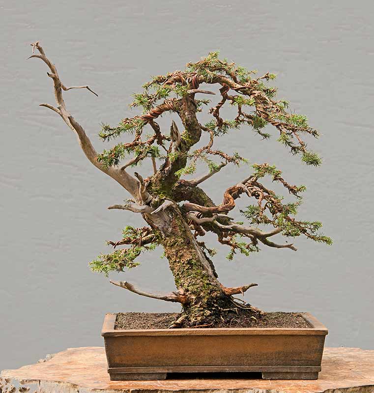 European spruce, Picea abies, collected in Austria with Drago in 2002. See development until today. The time had come to restyle the tree a second time throughly. So I took off all the guy wires, cut off a lot of old growth on the top and wired everything again. Now the wire will stay on for another three to four years. Then it will be a remarkable tree with lots of character, looking like a very old spruce on the mountains. Or so I hope.