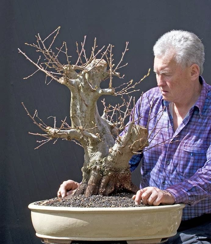 Wild plum, Prunus cerasifera, collected in Croatia in 2012 (!!!). pot by Walter Venne. Many people think that one finds a finished bonsai in the wilderness an plants it into a pot - and here we are with a naturalistic piece of art. Well, it isn't like this in real life. But once in a lifetime it happens. This tree was formed by cows. They did a great job, but I still feel the need to edit their wor. In a couple of years there will not be any really ugly guy wires and the tree will have hundreds of tiny white flowers in March. This shold be a killer tree for Noelanders Trophy eventually if I manage to ahve it flower in January. Just put it into a warm greenhouse in December. Or so I dream.
