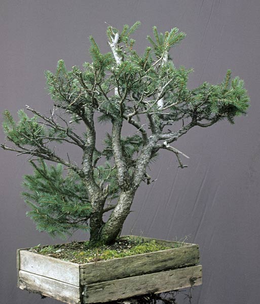 European spruce, Picea abies, collected in Austria in 1997. First image of 2000. The old pot by Derek Aspinall is a very fine one, but not so much for this kind of tree. The new pot by Gabriele Wirth from Germany enhances the elegance I believe. In late summer next year the crown will be fully wired again.