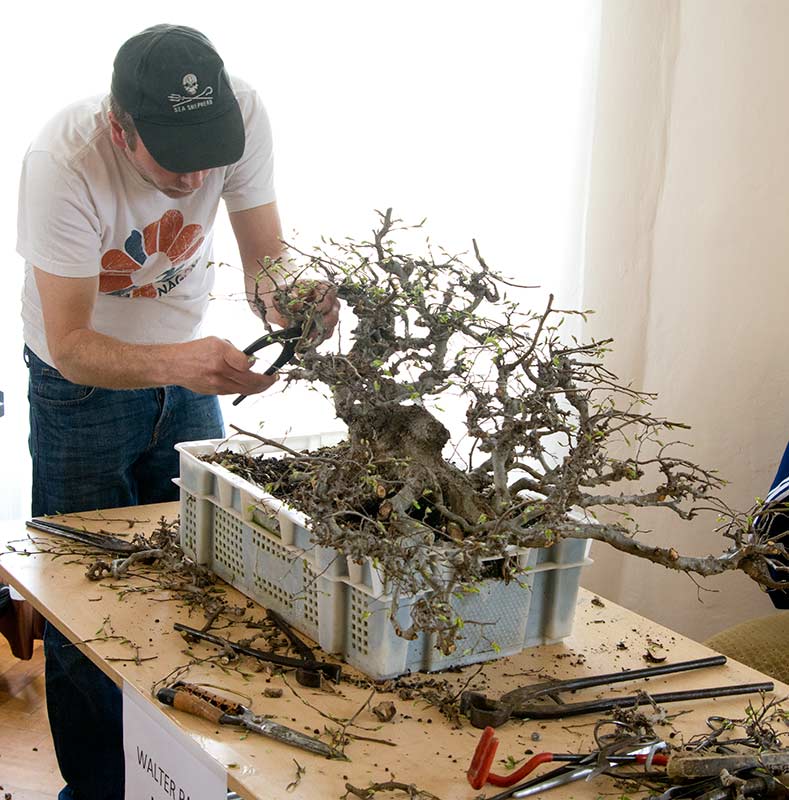 This is the hornbeam which was styled last weekend in Poland on the castle with Thomas. Juraj Marcinko from Switzerland showed a couple of refinement techniques on it as well. It was an unusual demo because broadlaved trees are very rarely used on demos and a full repotting is also normally not done. This tree is not finished, of course. It will be left alone for a year, growing freely. in spring of 206 I will wire most thicker branches and all the small ones.