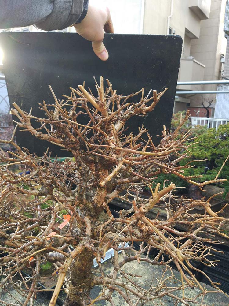 Snow Flake Tree #1 - The tree was shortened considerably because it was too high. Now the proportions are much better. All branches were wired thoroughly. The tree is supped to look more like a wild tree than a bonsai. This requires sacrifice of momentary beauty for future quality. The trunk is too thin and the taper is not good in the upper part. Therefore the lower part of the tree will be hedge pruned for a couple of years. This will look strange for a while, but it should, at lest partially, solve the problem. In about five years the tree should shine and have a thousand white blossoms that look like snow flakes
